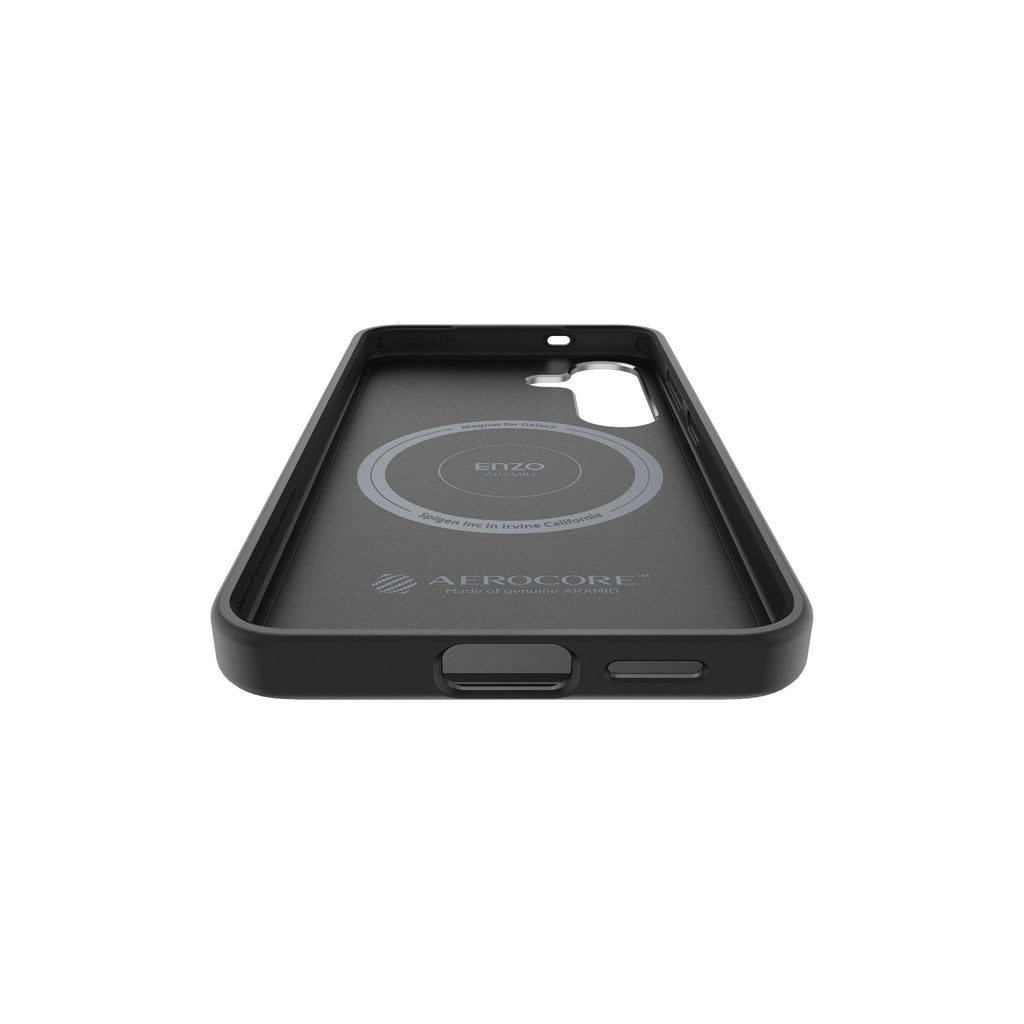 The Samsung Galaxy S25+ Enzo Aramid Case has and integrated magnetic ring included to keep the device safe and aligned and use MagFit accessories. Made from premium bulletproof Aerocore Aramid and TPU for superb durability. Rigid outer shell with a carbon finish and lined with a soft suede interior. Mil-grade certified drop protection. Diamond-cut anodized hardware for a durable non-corrosive finish. Raised edges for screen and camera protection.